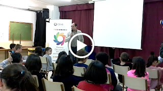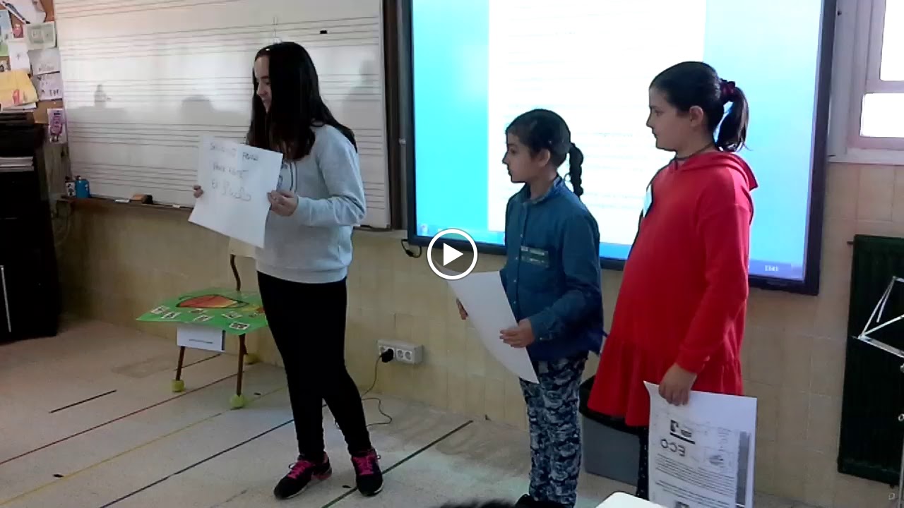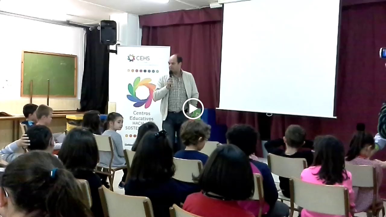 4. Teatro Sostenible (parte 1 y 2) un grupo de alumnos de 1er ciclo amenizaron e inspiraron conductas sostenibles en un divertido teatrillo de situaciones cotidianas: la aparición del novio "ecologista" de la hija, soluciona los problemas de la familia.4.Exposición "Nuestro Recorrido CEHS": Visualización de un vídeo que resume el trayecto recorrido. Al finalizar los delegados responden individualmente a tres preguntas: ¿qué te ha aportado a tí la participación en CEHS? ¿qué le ha aportado a tu centro educativo? ¿seguirías en el proyecto CEHS? Con estas preguntas reflexionadas y mirando al futuro, pasan al world Café.